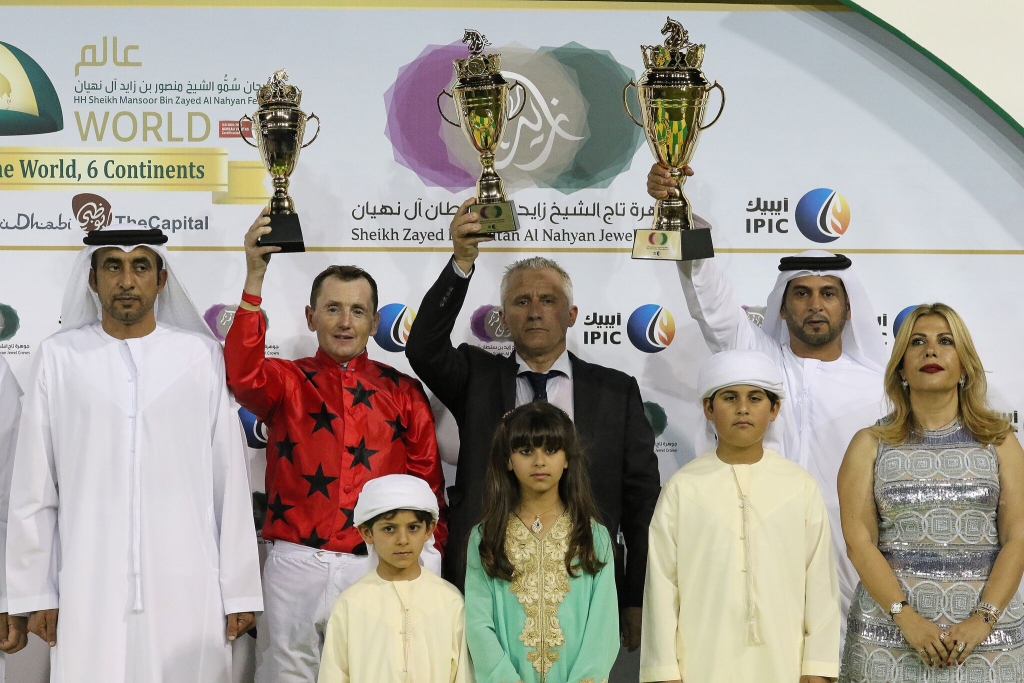 On November 13th 2016 American bred superstar RB BURN (MAJD AL ARAB X BURNIE GEE PW) wins the Sheikh Zayed Bin Sultan Al Nahyan Jewel Crown race GR 1 over 1600 meters! The stunning 4 year old colt was ridden by Gerald Avranche and trained by Eric LEMARTINEL-stealing the limelight from powerhouse AL MOURTAJEZ.